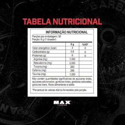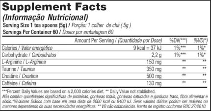 Ingredientes   Maltodextrina, creatina monohidratada, taurina, arginina, cafeína, aromatizantes, antiumectante dióxido de silício, edulcorante sucralose, emulsificante goma xantana e corante