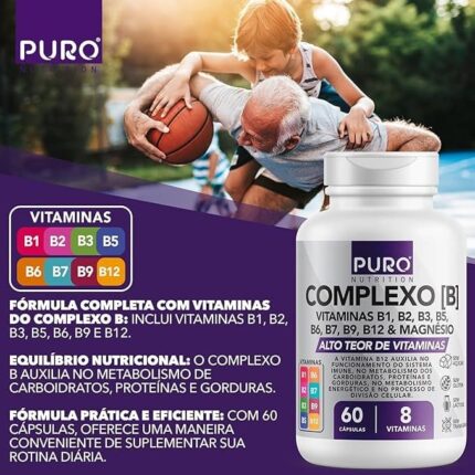 Complexo B Puro Nutrition – Vitaminas B1, B2, B3, B5, B6, B9, B12 e Magnésio, 60 Cápsulas