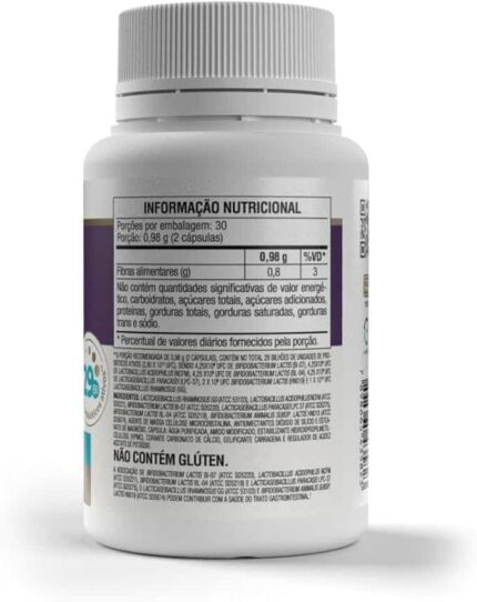 Ingredientes Lactobacillus acidophilus, Lactobacillus casei, Lactococcus lactis, Bifidobacterium bifidum, Bifidobacterium lactis e agentes de massa amido de milho e