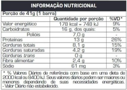 Blend proteico (caseinato de cálcio, proteína concentrada de leite, proteína de soro do leite concentrada, proteína de soro do leite isolada e colágeno hidrolisado), cobertura de chocolate branco, recheio cremoso sabor chocolate branco, óleo de palma (Elaeis guineenses), iogurte natural integral em pó, polidextrose, crispies sabor morango, vitaminas (acetato de retinol, colecalciferol, cloridrato de piridoxina, ácido fólico e cianocobalamina), minerais (sulfato de zinco, selenito de sódio e picolinato de cromo), aromatizantes, cloreto de sódio, edulcorantes sorbitol e sucralose, umectante glicerol, antiumectante fosfato tricálcico, emulsificantes goma acácia e lecitina de girassol, conservantes sorbato de potássio e benzoato de sódio, antioxidante DI-alfa-tocoferol e corantes vermelho allura Ac e carmins. CONTÉM LACTOSE. ALÉRGICOS: CONTÉM DERIVADOS DE LEITE E SOJA. PODE CONTER AMENDOIM E AVELÃ. NÃO CONTÉM GLÚTEN.
