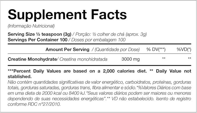 Creatina Monohidratada. PODE CONTER LEITE, OVO, AMENDOIM, SOJA E DERIVADOS. NÃO CONTÉM GLÚTEN.