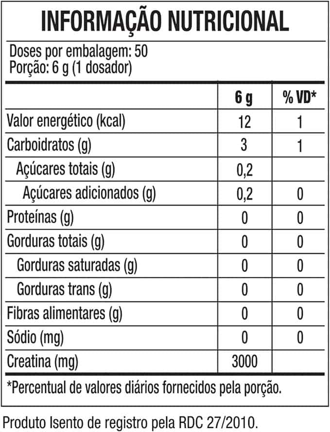 Creatina Monohidratada e maltodextrina. ALÉRGICOS: PODE CONTER LEITE, OVO, AMENDOIM, SOJA, TRIGO E SEUS DERIVADOS. NÃO CONTÉM GLÚTEN.
