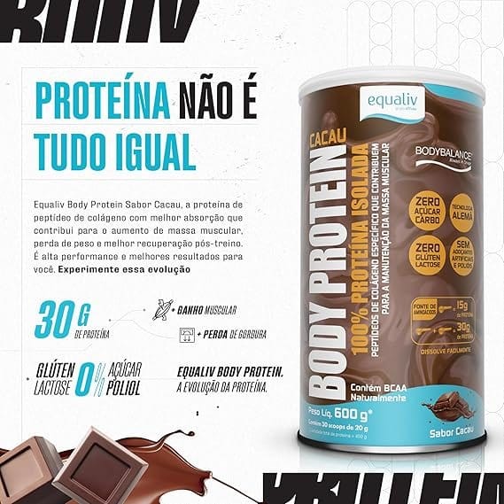 Body Protein (600g) A PROTEÍNA MAIS TECNOLÓGICA DO MERCADO! Equaliv Body Protein é uma proteína isolada e hidrolisada à base de peptídeos de colágeno, com a tecnologia inovadora alemã BODYBALANCE, trata-se de uma proteína isolada à base de peptídeos de colágeno que contribui para o aumento da massa muscular, emagrecimento, aumento da força e recuperação pós-treino. PROTEÍNA NÃO É TUDO IGUAL! Body Protein não é proveniente do soro do leite, sendo assim, pode ser consumido tranquilamente por todos aqueles intolerantes à lactose. Outro diferencial é a presença de aminoácidos de cadeia ramificada (BCAA), a leucina, isoleucina e valina, os quais correspondem a cerca de 35% dos aminoácidos essenciais em proteínas musculares. Benefícios: – Zero açúcar, Zero Glúten e Zero Lactose;- Tecnologia Alemã;- Sem adoçantes artificiais e Polióis.