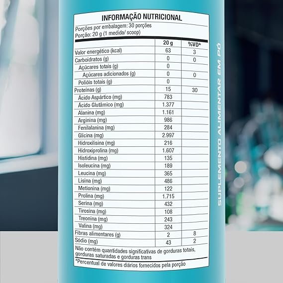 SUGESTÃO DE USO: Consumir 1 (um) ou 2 (dois) copo-medida (scoop) ao dia, antes e/ou depois do treino ou conforme orientação do médico e/ou nutricionista. Adicionar o conteúdo de 1 (um) copo-medida (scoop) para cada 200 ml de água ou bebida de sua preferência, agitando até dissolver. Ou consuma conforme orientação profissional. INGREDIENTES: Neutro: Colágeno Hidrolisado. NÃO CONTÉM GLÚTEN. SEM ADIÇÃO DE AÇÚCARES. Cacau: Colágeno hidrolisado, cacau em pó, (edulcorantes naturais) taumatina e glicosídeos de esteviol, (espessante) goma xantana e (antiumectante) dióxido de silício e (aromatizantes) aroma idêntico ao natural de creme e aroma idêntico do natural de cacauçlç. NÃO CONTÉM GLUTEN. SEM ADIÇÃO DE AÇÚCARES. Frutas Vermelhas: Colágeno hidrolisado, morango, amora e framboesa em pó, (aromatizantes) aromas naturais de baunilha e morango (espessante) goma xantana, (acidulante) ácido cítrico, (antiumectante) dióxido de silício e (edulcorantes naturais) taumatina e glicosídeos de esteviol. NÃO CONTÉM GLUTEN. SEM ADIÇÃO DE AÇÚCARES. Baunilha: Colágeno hidrolisado, triglicerídeos de cadeia média em pó, (aromatizantes) aromas naturais de baunilha, (antiumectante) dióxido de silício, (espessante) goma xantana e (edulcorantes naturais) taumatina e glicosídeos de esteviol. NÃO CONTÉM GLUTEN. SEM ADIÇÃO DE AÇÚCARES. Coco: Colágeno hidrolisado, coco em pó, triglicerídeos de cadeia média em pó, (espessantes) goma arábica, goma xantana, (antiumectante) dióxido de silício, (aromatizantes) mix de aromas natural e idênticos ao natural e (edulcorantes naturais) taumatina e glicosídeos de esteviol de Stevia rebaudiana Bertoni. NÃO CONTÉM GLÚTEN. Cookies: Colágeno hidrolisado, nibs de cacau”, triglicerídeos de cadeia média, (aromatizantes) mix de aroma natural e idênticos ao natural, (antiumectante) dióxido de silício, (emulsificantes) goma xantana e goma arábica, (edulcorantes naturais) glicosídeos de esteviol de Stevia rebaudiana Bertoni e taumatina. (*) fornece quantidades não significativas de açúcares. ALÉRGICOS: PODE CONTER LEITE. NÃO CONTÉM GLÚTEN.