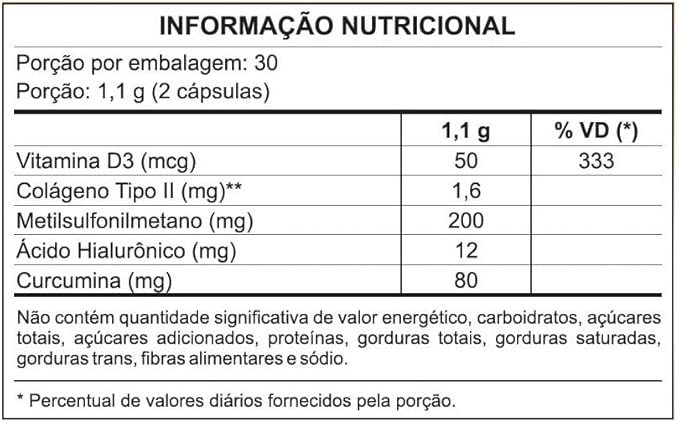 Colágeno tipo II, Cúrcuma, Ácido Hialurônico, MSM (Metilsulfonilmetano) e Vitamina D3