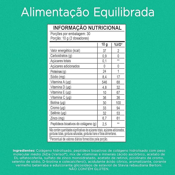 Colágeno hidrolisado, peptídeos bioativos de colágeno hidrolisado com peso molecular médio 2kDa (Verisol®), mix de vitaminas e minerais (ácido ascórbico, acetato de DL-alfatocoferila, sulfato de zinco monoidratado, acetato de retinol, picolinato de cromo, selenito de sódio, D-biotina e colecalciferol), acidulante ácido cítrico, aromatizante, corante vermelho beterraba e edulcorante glicosídeos de esteviol de Stevia rebaudiana Bertoni. NÃO CONTÉM GLÚTEN