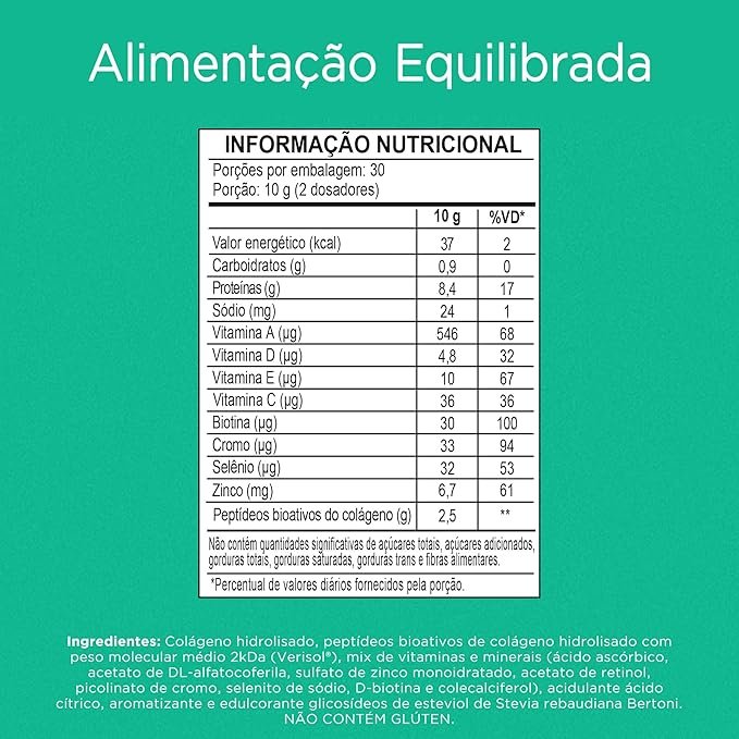 Colágeno hidrolisado, peptídeos bioativos de colágeno hidrolisado com peso molecular médio 2kDa (Verisol®), mix de vitaminas e minerais (ácido ascórbico, acetato de DL-alfatocoferila, sulfato de zinco monoidratado, acetato de retinol, picolinato de cromo, selenito de sódio, D-biotina e colecalciferol), acidulante ácido cítrico, aromatizante e edulcorante glicosídeos de esteviol de Stevia rebaudiana Bertoni. NÃO CONTÉM GLÚTEN.