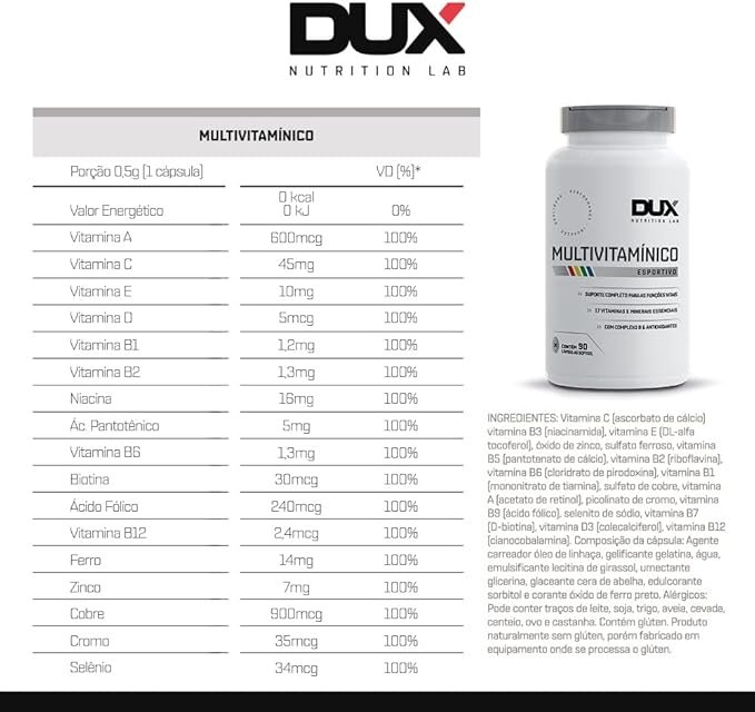 DUX® Multivitamínico – 17 micronutrientes ativos, em formas nobres, para atender 100% das necessidades do organismo: Produção hormonal; Performance atlética; Produção energética; Saúde imunológica; Saúde dos ossos; Antioxidantes; Bom funcionamento metabólico.