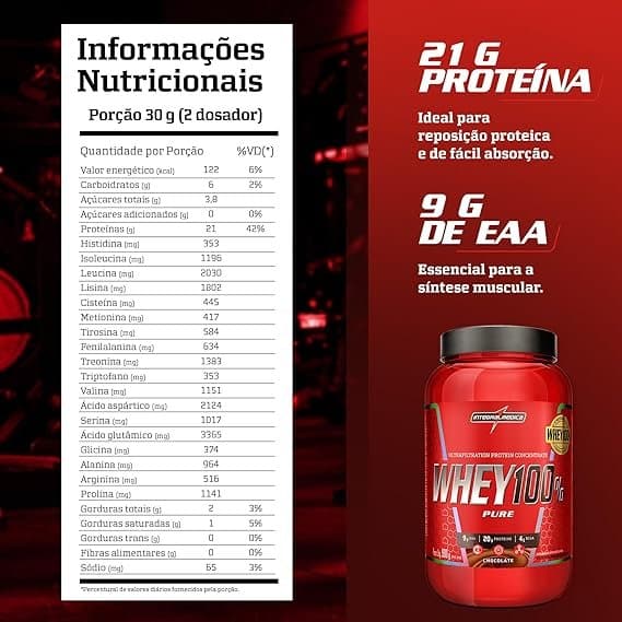 Em até 3x de R$ 70,00 sem juros Integralmédica – Whey Protein Concentrado Chocolate 100% Pure – 21g de Proteína por Scoop, Suplementação Alimentar Pós-Treino, Fórmula Enriquecida com BCAAs – Pote 900g