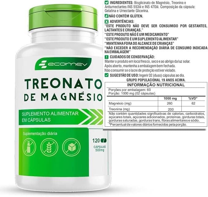 Em até 2x de R$ 27,75 sem juros Magnesio L – Treonato 500mg 120 capsulas 100% Puro Ecomev