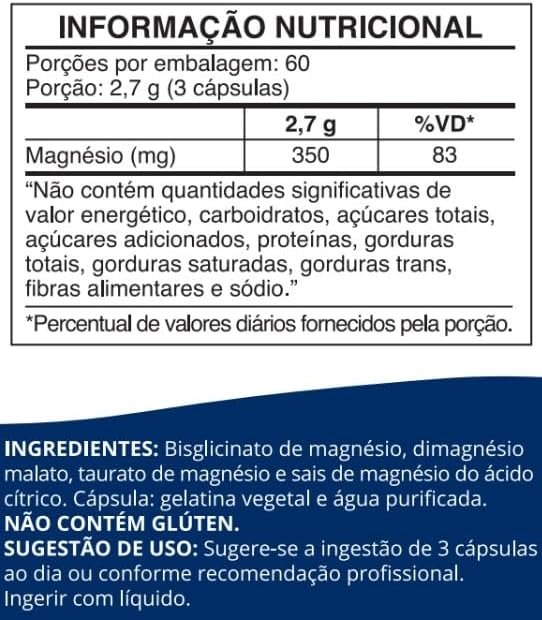Bisglicinato de magnésio, dimagnésio malato, taurato de magnésio e sais de magnésio do ácido cítrico. Cápsula: gelatina vegetal e água purificada. NÃO CONTÉM GLÚTEN