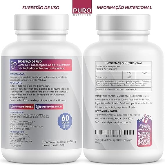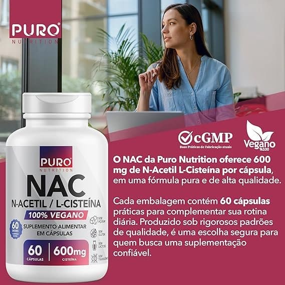 Em até 2x de R$ 21,75 sem juros NAC N-Acetil L-Cisteína 600mg Puro Nutrition — 600 mg, 60 Cápsulas Veganas