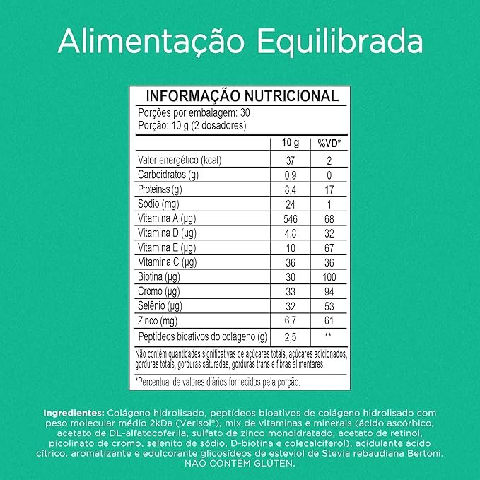 Colágeno hidrolisado, peptídeos bioativos de colágeno hidrolisado com peso molecular médio 2kDa (Verisol®), mix de vitaminas e minerais (ácido ascórbico, acetato de DL-alfatocoferila, sulfato de zinco monoidratado, acetato de retinol, picolinato de cromo, selenito de sódio, D-biotina e colecalciferol), acidulante ácido cítrico, aromatizante e edulcorante glicosídeos de esteviol de Stevia rebaudiana Bertoni. NÃO CONTÉM GLÚTEN.