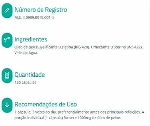Óleo de peixe. Gelificante: gelatina (INS 428). Umectante: glicerina (INS 422). Veículo: Água.