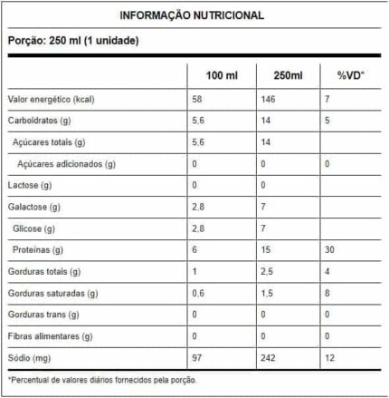 | Aditivos | Proteína do soro do leite, Zero Açúcar, Zero Lactose |