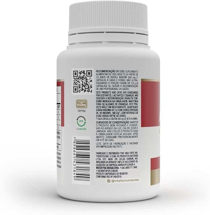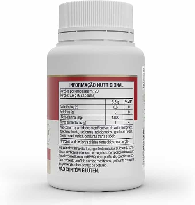 É um suplemento alimentar em cápsulas, que contém alta concentração do aminoácido beta-alanina, com zero adição de açúcares e corantes artificiais. Produto vegano. Não contém glúten