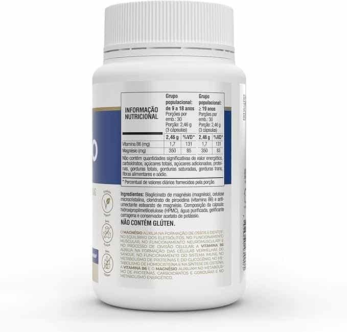 SUGESTÃO DE USO:Ingerir 2,46 g (3 cápsulas) ao dia ou seguir a recomendação de um profissional da saúde. INGREDIENTES: Bisglicinato de magnésio (magnésio), celulose microcristalina, cloridrato de piroxidina (vitamina B6) e anti- umectante estearato de magnésio. Composição da cápsula: hidroxipropilmetilcelulose (HPMC), água purificada, gelificante carragena e conservador acetato de potássio. NÃO CONTÉM GLÚTEN.