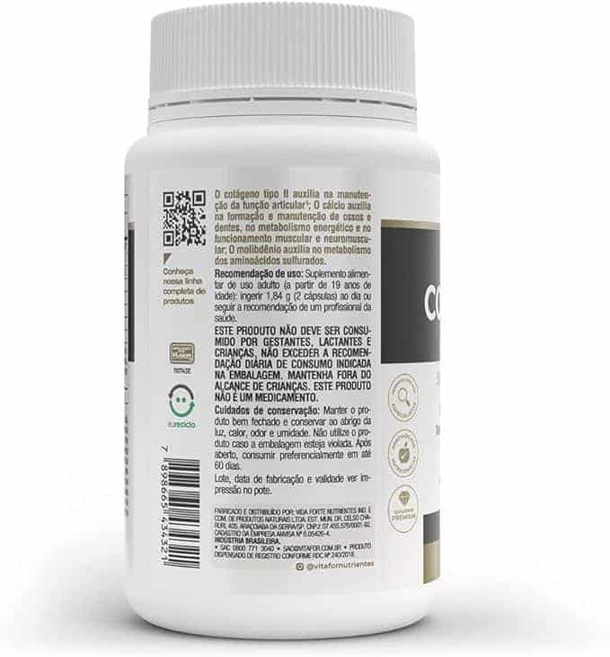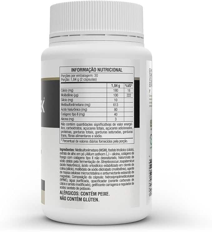 INGREDIENTES: Metilsulfonilmetano (MSM), fosfato tricálcico (cálcio), extrato de alho em pó (Allium sativum L.)- alicina, colágeno de frango com colágeno tipo Il não desnaturado, hialuronato de sódio obtido pela fermentação de Streptococcus zoopidemicus (ácido hialurônico), ácido ortosilícico estabilizado em cloreto de colina (silício), molibdato de sódio diidratado (molibd?nio), agente de massa celulose microcristalina e antiumectante estearato de magnésio. Composição da cápsula: hidroxipropilmetilcelulose (HPMC), água purificada, opacificador (corante carbonato de cálcio e amido modificado), gelificante carragena e regulador de acidez acetato de potássio. ALÉRGICOS: CONTÉM PEIXE. NÃO CONTÉM GLÚTEN. SUGESTÃO DE USO: Ingerir 1,5 (2 cápsulas) ao dia, preferencialmente antes das principais refeições ou seguir a recomendação de um profissional de saúde.