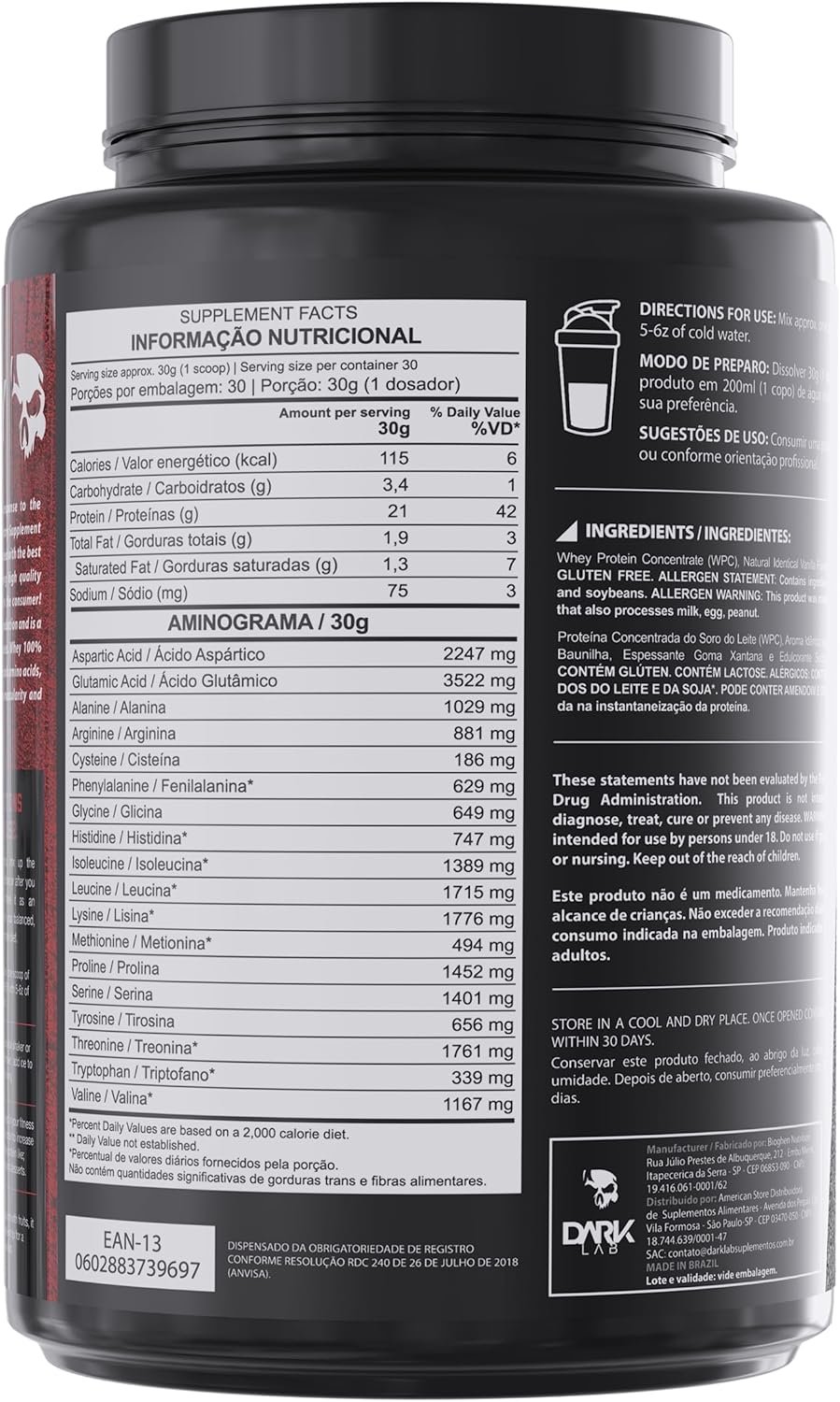 A 100% Whey Protein é o suplemento alimentar perfeito para quem busca um corpo saudável e definido! Tendo como principal componente a Proteína concentrada do soro de leite, são 21g de proteína por dose, 8,6g de aminoácidos essenciais e 4,2g de BCAA. O Whey Protein Concentrado é uma forma de Whey Protein que passa por um processo de filtragem para concentrar suas proteínas e remover carboidratos e gorduras. Ele é amplamente utilizado por atletas e praticantes de atividades físicas para ajudar no ganho de massa muscular, recuperação e fortalecimento do sistema imunológico. Com proteína concentrada de alta qualidade, nossa Whey Protein é facilmente absorvida pelo organismo, fornecendo os nutrientes necessários para a reparação muscular pós-treino. Além disso, o 100% Whey tem um sabor delicioso e é livre de glúten. Experimente o melhor, entre para o Team Dark Lab.
