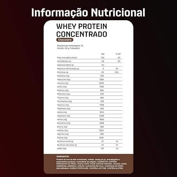 Proteína concentrada do soro do leite, cacau em pó, aromas idênticos aos naturais, edulcorantes sucralose e acessulfame de potássio e emulsificante lecitina de soja. CONTÉM LACTOSE. CONTÉM GLÚTEN.¹ALÉRGICOS: CONTÉM DERIVADOS DE LEITE E SOJA. PODE CONTER TRIGO, AVEIA, CEVADA, CENTEIO, OVO E CASTANHA. ¹PRODUTO NATURALMENTE SEM GLÚTEN, PORÉM FABRICADO EM EQUIPAMENTO ONDE SE PROCESSA O GLÚTEN.