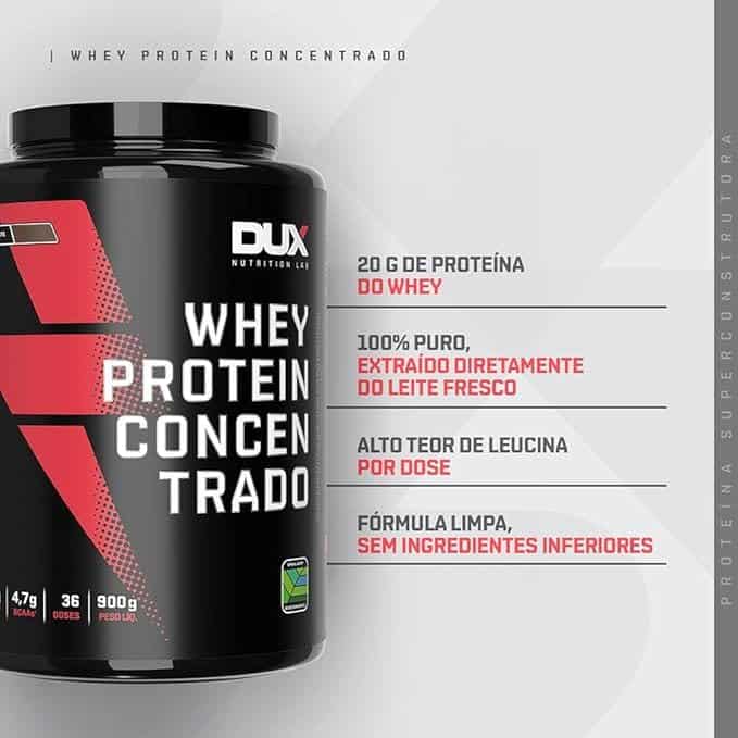 WHEY PROTEIN CONCENTRADO (900g) – DUX NUTRITION O Whey Protein Concentrado Dux Nutriton é composto por proteínas de alto valor biológico e rápida absorção, além de gorduras essenciais, carboidratos e uma ampla gama de aminoácidos, fundamentais para garantir a síntese muscular acelerada após a prática de esportes. É ideal para ser consumido antes e depois de treinos, mas também pode fazer parte do café da manhã ou servir como um lanche entre as refeições, e em outros momentos conforme a orientação do seu nutricionista. Se há um nutriente indispensável, é a proteína. Ela é feita de aminoácidos, que são os blocos de construção do nosso corpo. A proteína do soro do leite, em inglês ?Whey Protein?, é uma das fontes de aminoácidos de melhor absorção, maior até que o frango ou peixe. Isso torna o Whey uma forma conveniente de ingerir proteína, melhorando a saúde, o bem-estar e os resultados dos treinos. BENEFÍCIOS: > Não contém goma xantana, complexos vitamínicos à base de maltodextrina, espessantes, estabilizantes, conservantes ou qualquer outro ingrediente inferior;> Contém corantes 100% naturais, sem ingredientes artificiais;> O nome diz tudo: Whey Protein Concentrado 100% puro, com transparência total, do nome do produto à lista de ingredientes;> Matéria-prima premium importada, com alto teor de leucina, desenvolvida para criar um produto com sabor real e marcante;> Valores nutricionais robustos, sem excessos, com quantidades ideais de carboidratos e gorduras do leite;> 20g de proteína;> Proteína moderna, desenvolvida por especialistas para atletas de esportes de performance (bodybuilding, crossfit e artes marciais), pessoas que buscam uma proteína com baixa caloria (para snacks fit e receitas sem culpa) e pessoas que buscam uma proteína ultrapura de altíssima qualidade.