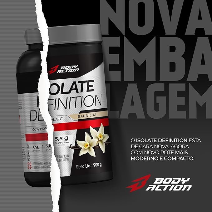 Isolate definition – body action      isolate definition bodyaction é uma das melhores proteínas isoladas na relação custo x benefício do mercado, trazendo uma excelente proposta para aqueles que buscam crescimento muscular sem riscos de acumulo de gordura corporal, ou para aqueles que buscam uma maior definição muscular, aliando baixo custo e qualidade.    formada através do isolamento da proteína do soro do leite por fluxo cruzado (cft ? exchange whey protein isolate) e por soy protein isolate (proteína isolada da soja premium), a isolate definition mantém a pureza da proteína e o seu alto valor biológico, reduzindo os níveis de lactose e gorduras.      isolate definition é rica em aminoácidos essenciais, substratos indispensáveis em diversos processos metabólicos, incluindo uma adequada síntese proteica muscular.     a mistura de whey protein isolada com proteína isolada de soja elabora um produto rico em bcaa (aminoácidos de cadeia ramificada) e glutamina, importantes aminoácidos envolvidos na melhora do sistema imunológico, que agem também como substratos para o fortalecimento das células do intestino e principalmente como recuperadores das células musculares.   benefícios      por ser constituída de 89% de proteínas em sua composição, a isolate bodyaction apresenta 5,1g de bcaa e 5,3g de glutamina por dose, tornando o produto excelente para atletas e praticantes de atividades físicas que necessitam aumentar o aporte proteico diário. entre outros benefícios podemos citar: melhora no ganho de massa muscular; ajuda na definição muscular; alto valor biológico; rápida digestão e absorção; zero gorduras; zero glúten; excelente custo x benefício.   apresentação:     potes com 450g, 900g e 2kg; embalagens stand up pouch 1,8kg.