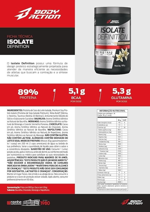 Isolate definition – body action isolate definition bodyaction é uma das melhores proteínas isoladas na relação custo x benefício do mercado, trazendo uma excelente proposta para aqueles que buscam crescimento muscular sem riscos de acumulo de gordura corporal, ou para aqueles que buscam uma maior definição muscular, aliando baixo custo e qualidade. formada através do isolamento da proteína do soro do leite por fluxo cruzado (cft ? exchange whey protein isolate) e por soy protein isolate (proteína isolada da soja premium), a isolate definition mantém a pureza da proteína e o seu alto valor biológico, reduzindo os níveis de lactose e gorduras. isolate definition é rica em aminoácidos essenciais, substratos indispensáveis em diversos processos metabólicos, incluindo uma adequada síntese proteica muscular. a mistura de whey protein isolada com proteína isolada de soja elabora um produto rico em bcaa (aminoácidos de cadeia ramificada) e glutamina, importantes aminoácidos envolvidos na melhora do sistema imunológico, que agem também como substratos para o fortalecimento das células do intestino e principalmente como recuperadores das células musculares. benefícios por ser constituída de 89% de proteínas em sua composição, a isolate bodyaction apresenta 5,1g de bcaa e 5,3g de glutamina por dose, tornando o produto excelente para atletas e praticantes de atividades físicas que necessitam aumentar o aporte proteico diário. entre outros benefícios podemos citar: melhora no ganho de massa muscular; ajuda na definição muscular; alto valor biológico; rápida digestão e absorção; zero gorduras; zero glúten; excelente custo x benefício. apresentação: potes com 450g, 900g e 2kg; embalagens stand up pouch 1,8kg.